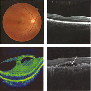 The images above show (clockwise from top left): a healthy retina; a healthy scan of the macula; dry age-related macula degeneration; vitreomacula traction.